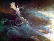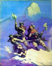 Frank Frazetta poster of a warrior on a horse confronted by a woman with bear