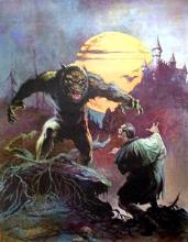 Frank Frazetta poster of two demon guys fighting with a glowing brain-like thing behind them