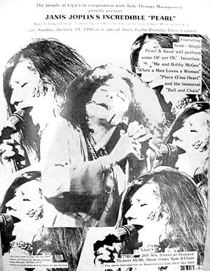 Singer who appeared on all of Janis' records Jan. 19 1986 Performing a Joplin B-day party concert at Lipps