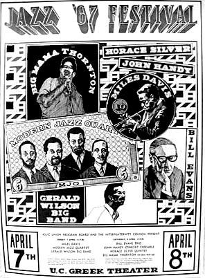Rare Concert Poster! Big Mamma Thorton,Horace Silver, John Handy, Miles Davis, Modern Jazz Quartet, Bill Evans, Gerald Wilson Big Band. April 7-8 at U.C. Greek Theater. Presented by ASUC Union Program and the Interfaternity Council.