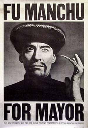 Huge poster of Christopher Lee starring as the evil criminal genius Fu ManChu in a series of movies that came out in the 1960's.