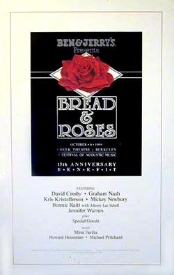Ben and jerry's presents Bread and Roses. A festival of acoustic music 15th aniversary benefit Oct 8 at the Greek Theatre featuring David Crosby,Graham Nash, Kris Kristofferson, Mickey Newbury, Bonnie Raitt and Jennifer Warnes.