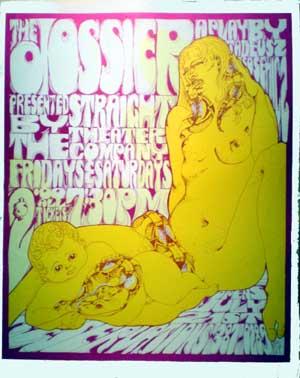 This strange poster of a woman giving birth was an advertizement for a play called the Dossier that was held at the Straight Theatre, a very rare and collectible venue in San Francisco.