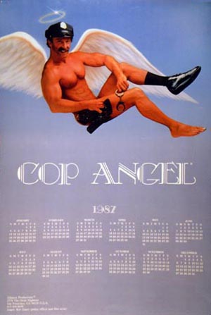 Laminated 1987 calendar poster of the famous and popular out, gay San Francisco cop, Bob Geary. Says: "Police officer and film actor"