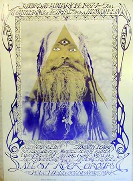 Grateful Dead, Jefferson Airplane, Quicksilver Messenger Service, Dizzy Gillespie, Allen Ginsburg, other lesser known local bands, and spur-of-the-moment performers. Artists: Kelley Mouse, Michael Bowen. Photographer: Casey Sonnabend. The location was Golden Gate Park Polo Field.