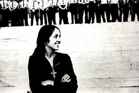Joan Baez standing in front of the state capital building in Montgomery, Alabama, at the March 26, 1965 Selma to Montgomery civil rights march led by Dr. Martin Luther King, Jr. At the time this picture was taken Miss Baez was listening to Dr. King's speech while waiting her turn to perform before the crowd who had come from across the United States to support the Federal voting rights act and oppose segregation in schools and public places. The troopers on the top steps of the capital building are Alabama state police.